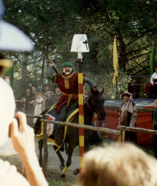 action from the jousting. The two riders start from opposite ends of