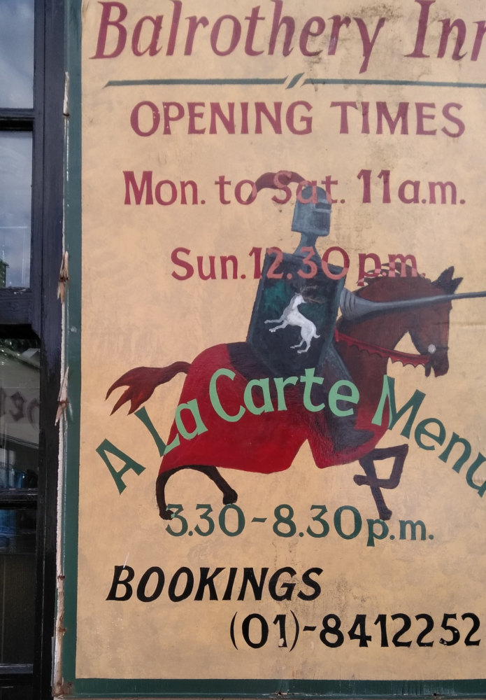 Browsing the internet, as you do, I'd found the Balrothery Inn, outside Balbriggan, about a half-hour walk from the hotel. I persuaded Grace that the walk would be good for our appetite, and off we went. When we found the place, a very old, traditional inn, we went in and found ourselves in a working men's bar, which was quaint in its own way, but didn't look likely for a dinner for two. However, the barman led us through a maze of twisty passages, all alike, to the other half of the establishment, which is a lot more upmarket.
